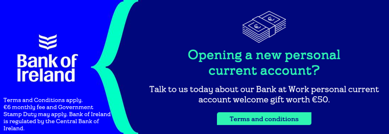 The Bank at Work personal current account welcome gift is available to employees of Bank at Work companies in the Republic of Ireland. You do not need to be Bank of Ireland customer. A “Bank at Work” company is one where the Bank of Ireland regularly promotes its products and services under the branding of “Bank at Work”.